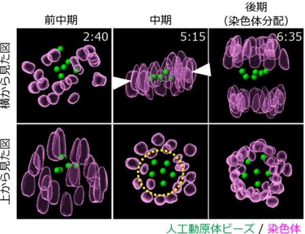 これを上から見ると、人工動原体ビーズは内側領域(黄色点線)を占領し、染色体がそこに入らないよう防ぐことが分かる。